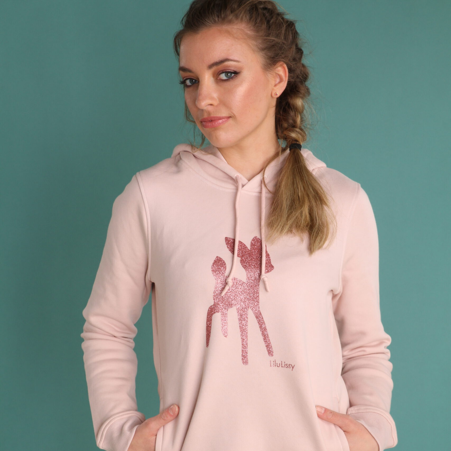 Hoodie in Rosa mit Bambi in Roségold als Aufdruck. In verschiedenen Größen erhältlich.
